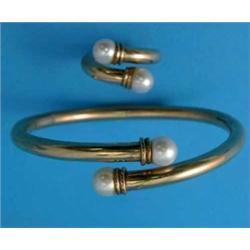 A yellow metal tubular stiff bangle, with cultured pearl terminals, and a matching ring...