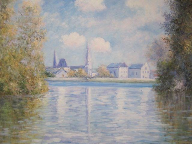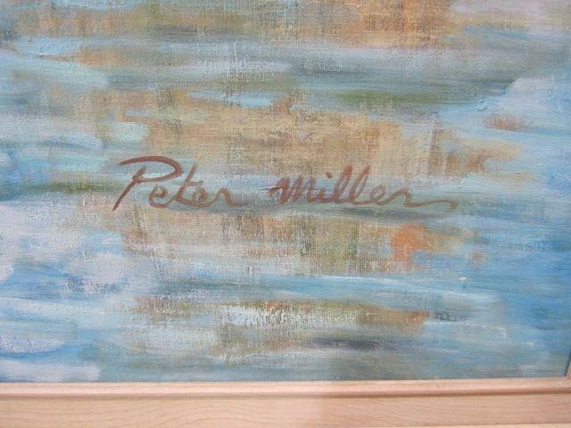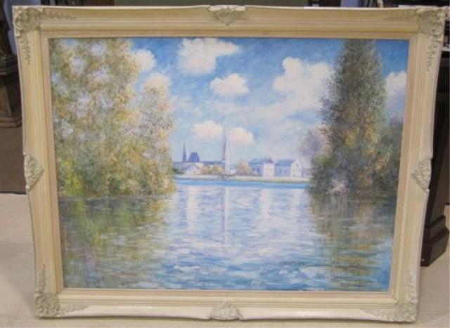 Signed. This was in the bedroom of Liberace. Painting depicts lake scene with white frame. Measures 44" x 55". Estimate $1,000 - $2,000