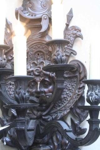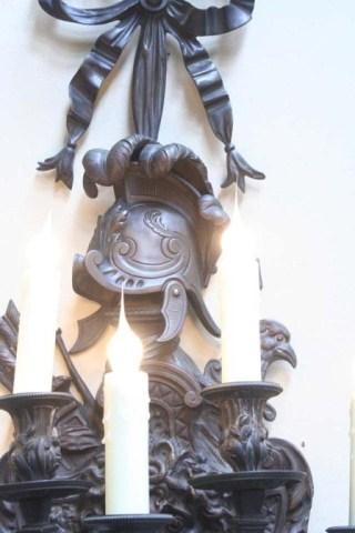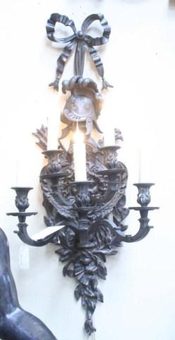 Circa: 1880. Origin: France. Dimension: 38.5"H x 14.5"W x 14.5"D. A very beautiful sconce with the addition of a soldier's helmet in the center of the sconce. Estimate $1,000 - $2,000.