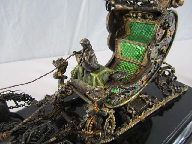 Faberge-style Austrian jeweled and enameled troika with driver. Beautifully done on wood base. Circa 1920. In good condition. Base measures 17" long x 8" wide. Estimate $12,000 - $16,000