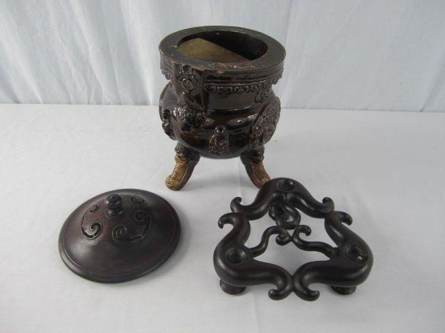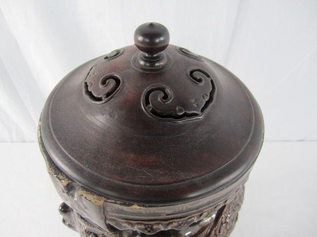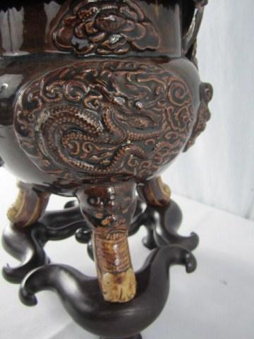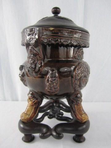 Early 19th century. Wood stand and lid great quality. Dragon and budda decoration. Measures 14" tall. Estimate $200 - $300