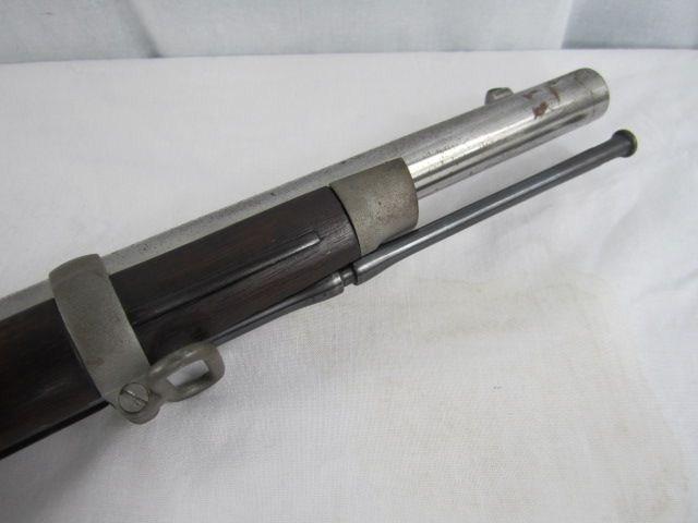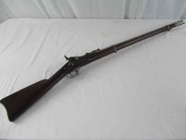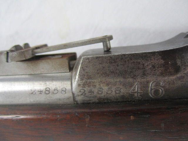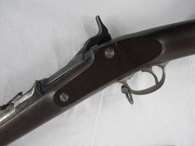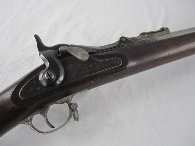 #24858. Good to very good condition with two inspectors cantouches on stock. Large #46 on left breech probably unit or regiment. Metal shows light cleaning and some pitting and natural aging. The first cartridge rifle issued to US Troops in