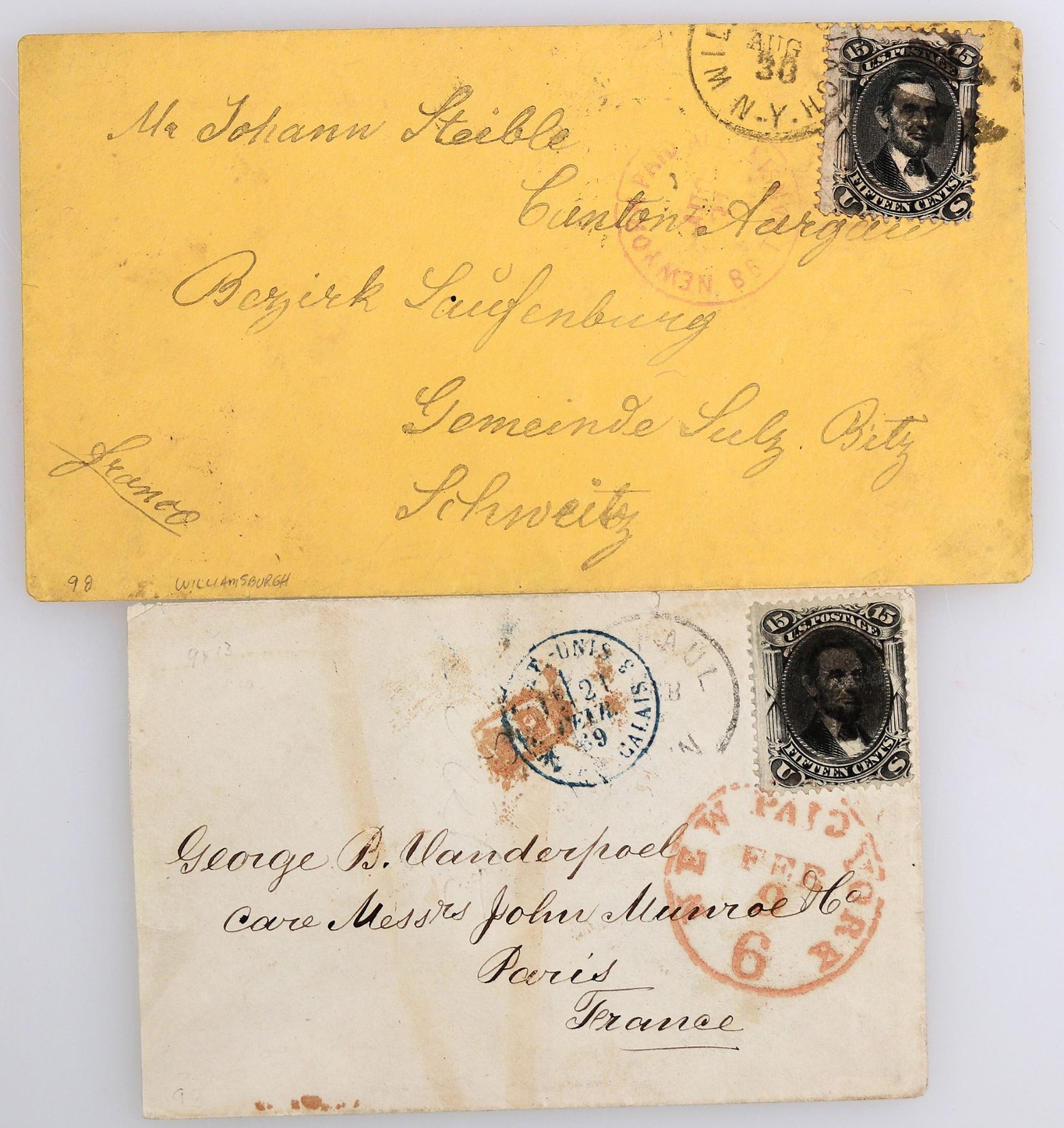 2x A33, black 15 cents on covers. St. Paul, MN to Paris with St. Paul, Calais and New York 6 cents paid front cancels, back pencil writing. New York to Schweitz France with Wil? New York and New York 3? cents paid front cancels, Laufenburg, Sulz and B?sel back cancels.