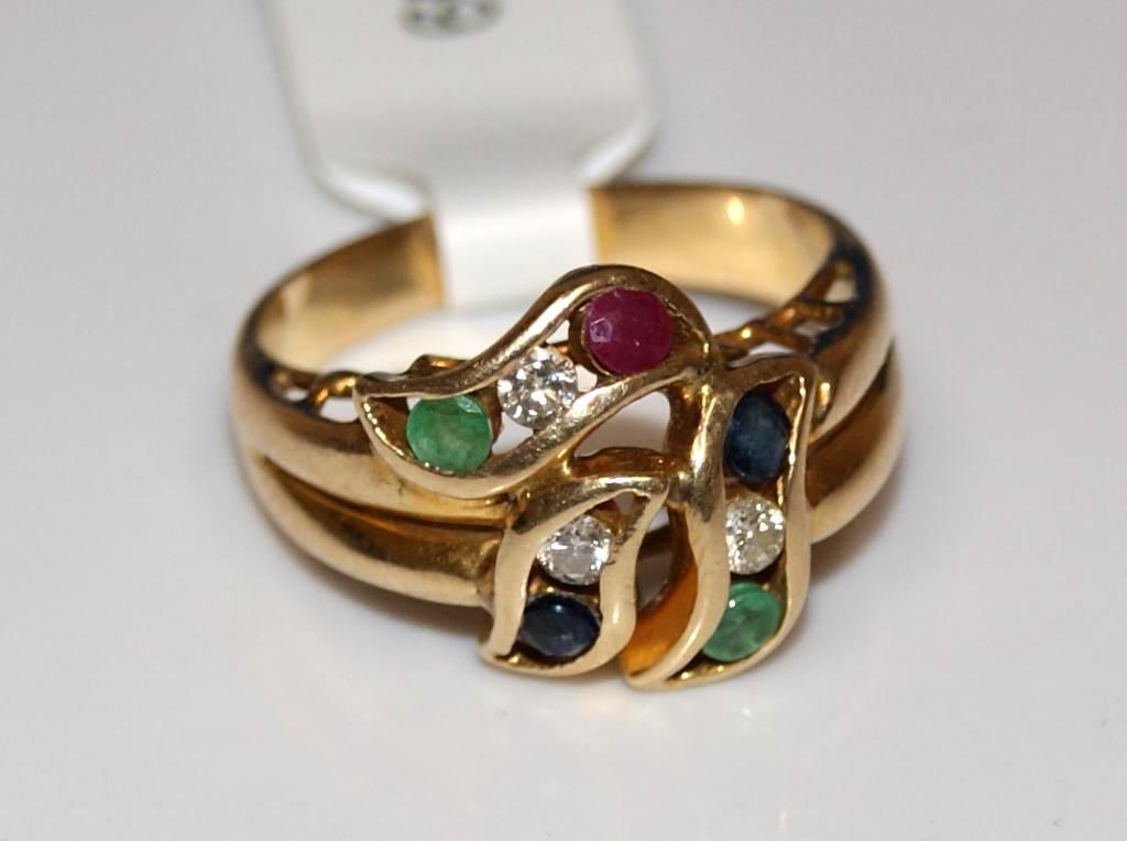 Retail Value $4,320 14Kt Yellow Gold -- AAA Burmese Ruby, Emerald, Sapphire & Diamonds Ladies Ring --