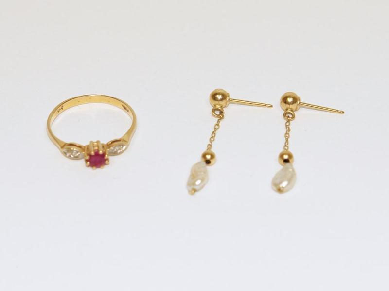 Total Retail $2,760 14Kt Yellow Gold -- Being Sold Times Money -- (#1) Retail Price $1,870 14Kt Yellow Gold -- AAA Burmese Ruby & Diamonds Ladies Ring -- (#2) Retail Price $890 14Kt Yellow Gold -- White Pearl Gold Ladies Studs Earrings --
