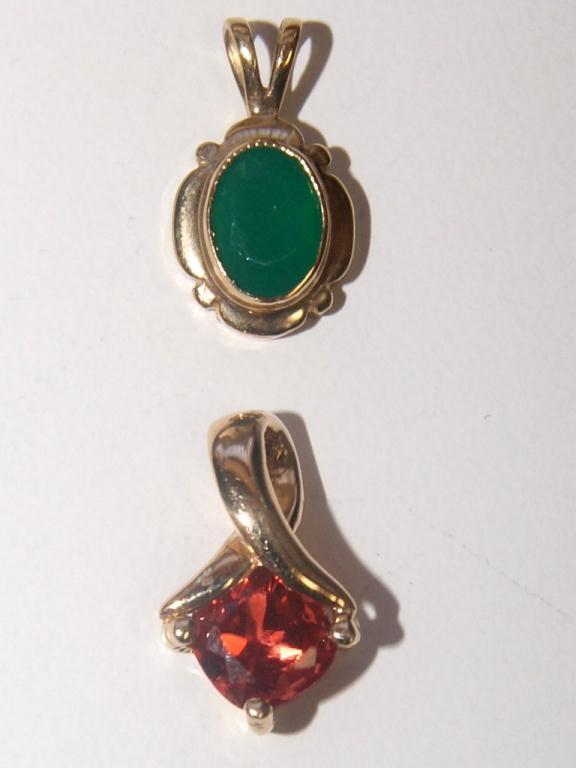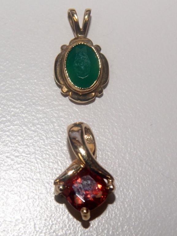 Total Retail $2,660 14Kt Yellow Gold Being Sold Times Money (#1) Retail Price $1,340 14Kt Yellow Gold AAA Light Garnet Hand Made Ladies Pendant (#2) Retail Price $1,320 14Kt Yellow Gold AAA Colombian Emerald Hand Made Ladies Pendant