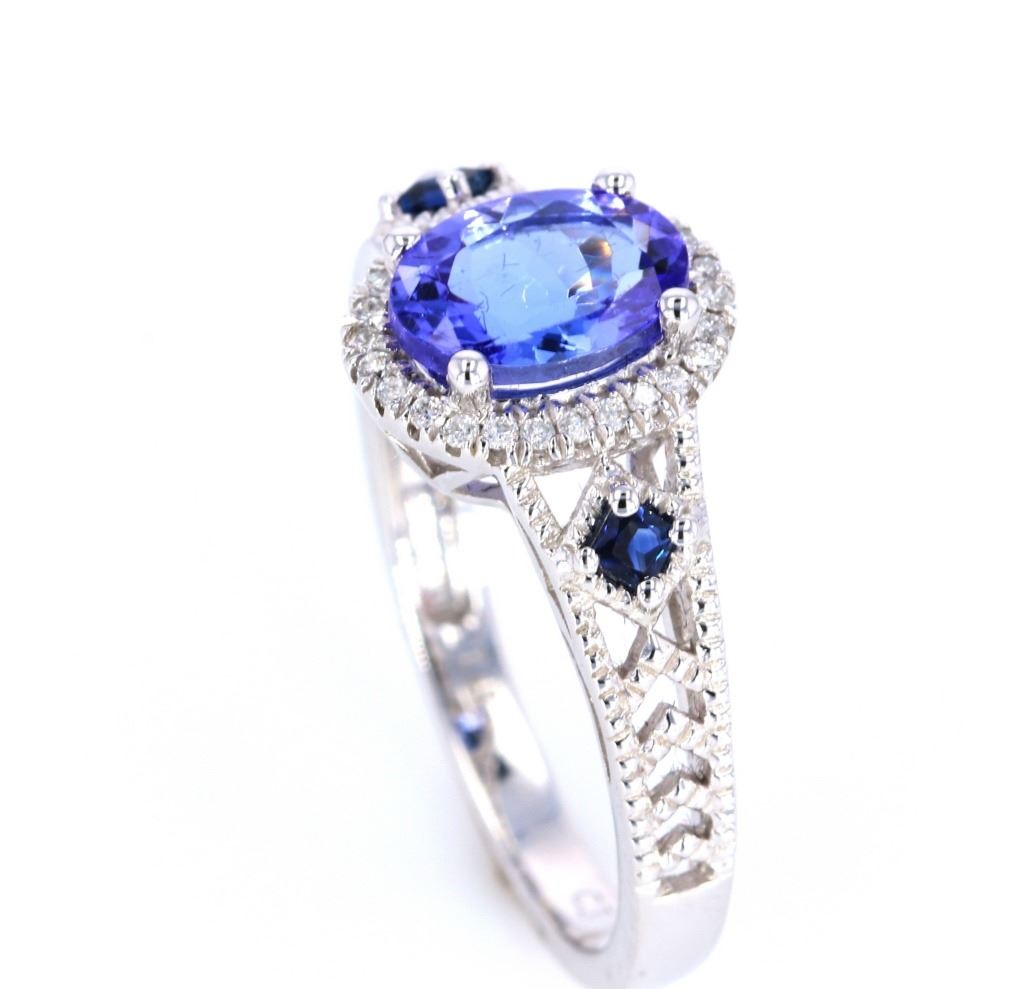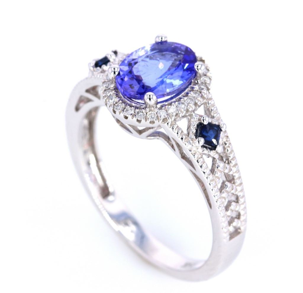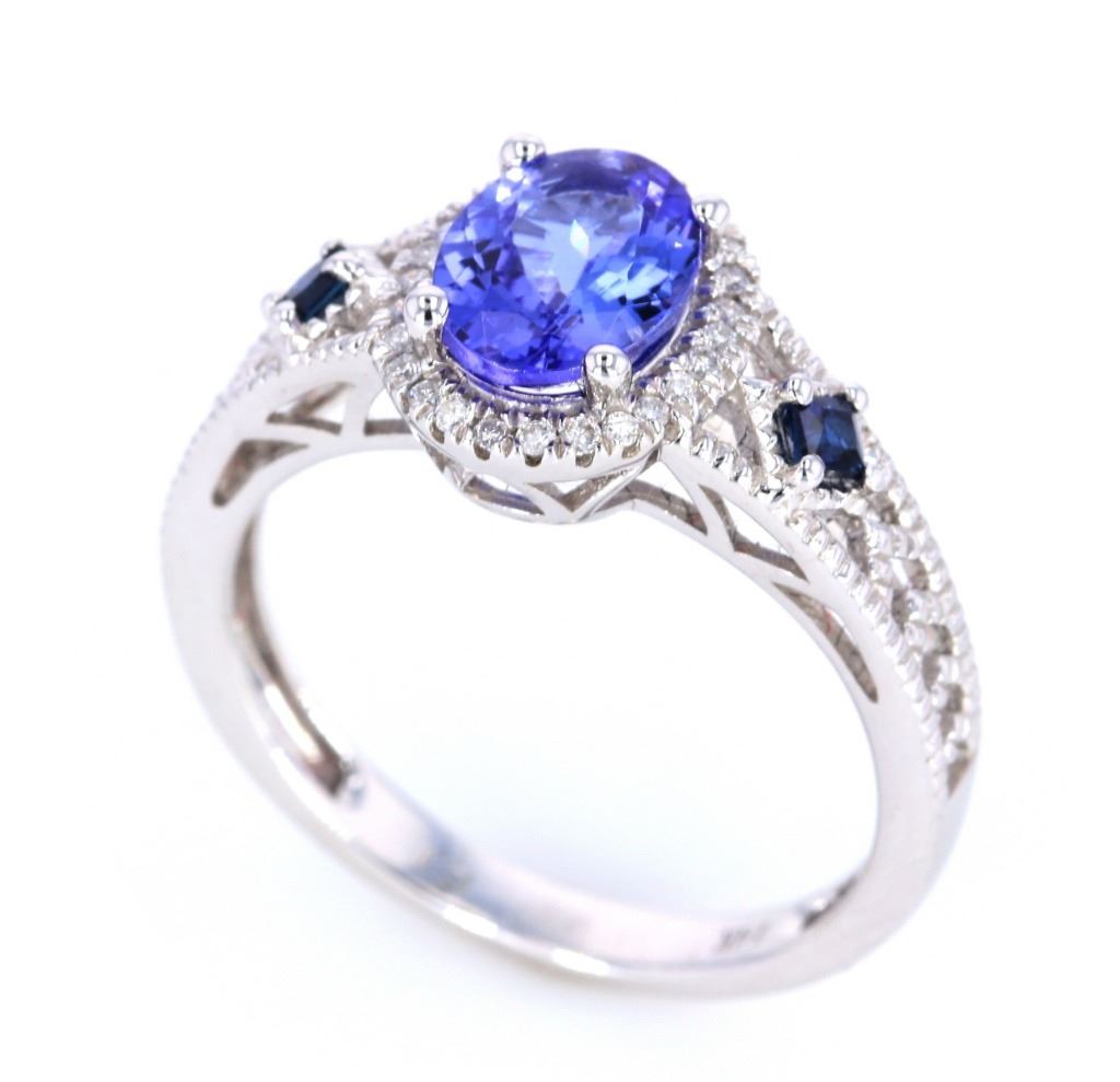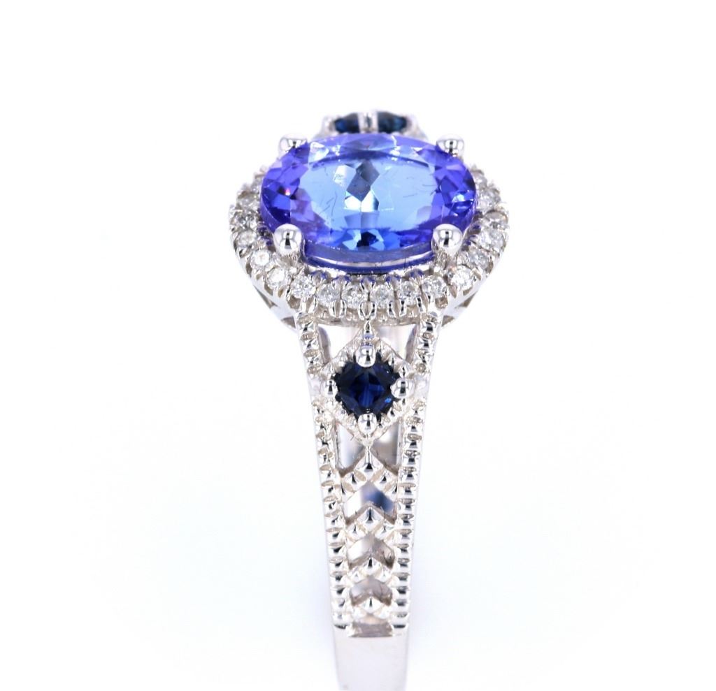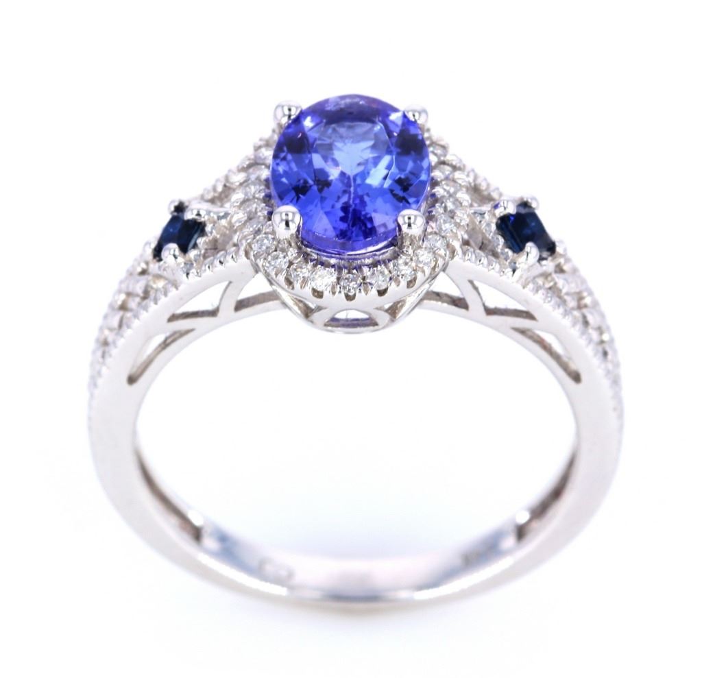 The lot features a fantastic Tanzanite and Diamond 14K white gold ring. Tanzanite Is a very rare precious gemstone that is only found in the Usumburu Mountains that border the Umba Valley of northern Tanzania. Originally discovered in 1967 by Tiffany & Company who named the stone Tanzanite. This example is unique due to its exceptional pleochroism (an optical phenomenon in which a stone has different colors when observed at different angles). This example shows an artful Art Deco styling brand new ring showing a 14K and CJ stamping. The ring holds a beautiful AAA Quality natural Tanzanite stone at the center having a nice transparent quality, oval modified brilliant cut and 1.37 carat weight. The ring is also accented by two square step cut Tanzanite stones with a weight of 0.12 carats. The center stone is prong set and shows a step halo bezel set with 26 round brilliant natural Diamonds having a weight of 0.11 carats. The ring is in brand new condition and is a fantastic custom-made piece. Size 7 US.