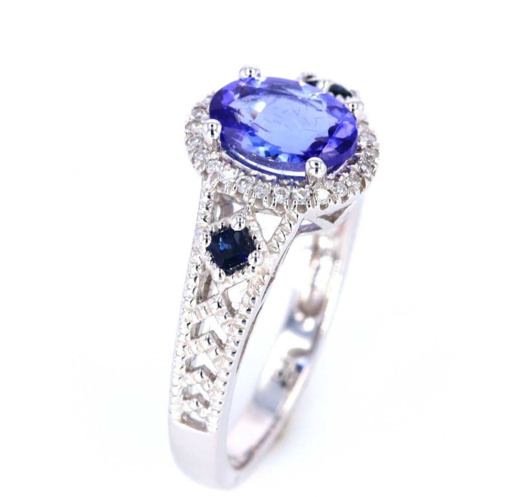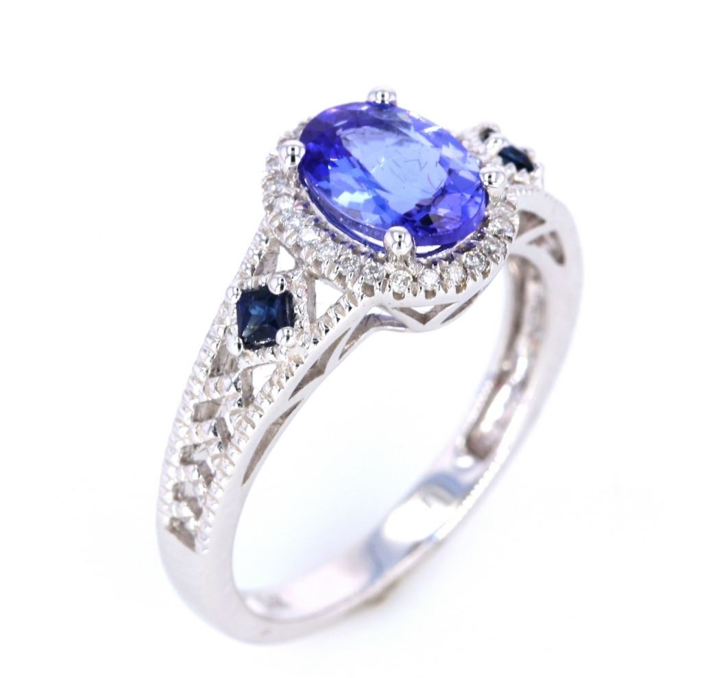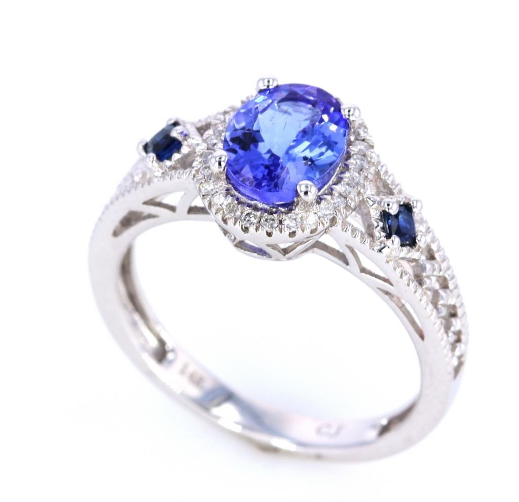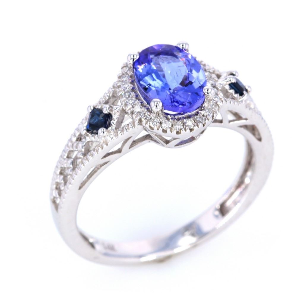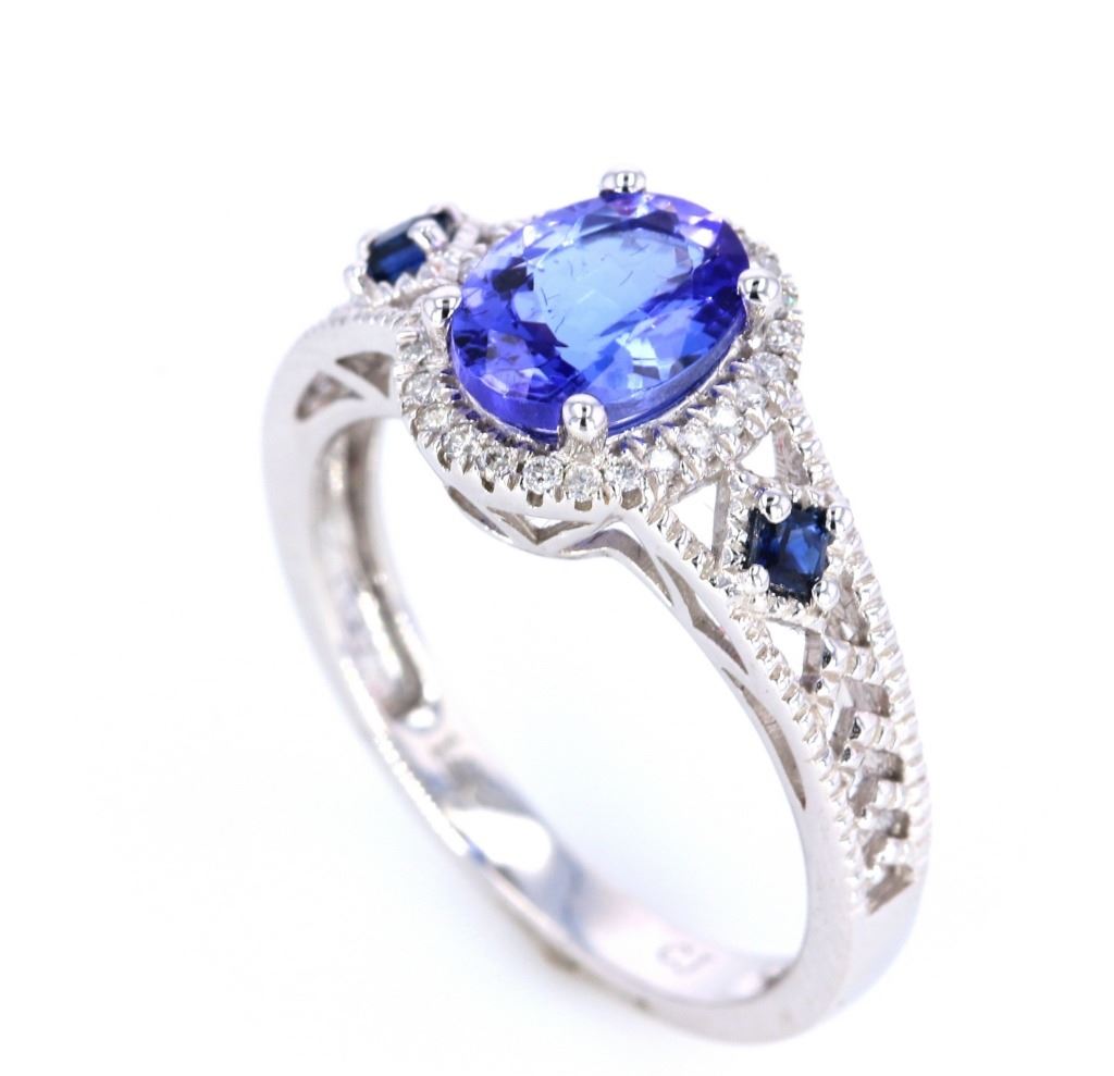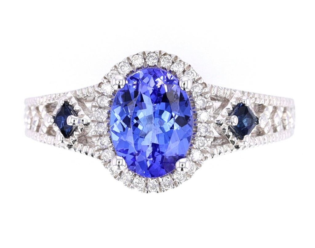 The lot features a fantastic Tanzanite and Diamond 14K white gold ring. Tanzanite Is a very rare precious gemstone that is only found in the Usumburu Mountains that border the Umba Valley of northern Tanzania. Originally discovered in 1967 by Tiffany & Company who named the stone Tanzanite. This example is unique due to its exceptional pleochroism (an optical phenomenon in which a stone has different colors when observed at different angles). This example shows an artful Art Deco styling brand new ring showing a 14K and CJ stamping. The ring holds a beautiful AAA Quality natural Tanzanite stone at the center having a nice transparent quality, oval modified brilliant cut and 1.37 carat weight. The ring is also accented by two square step cut Tanzanite stones with a weight of 0.12 carats. The center stone is prong set and shows a step halo bezel set with 26 round brilliant natural Diamonds having a weight of 0.11 carats. The ring is in brand new condition and is a fantastic custom-made piece. Size 7 US.