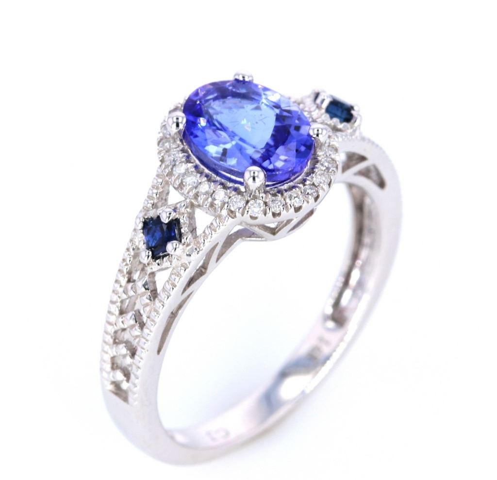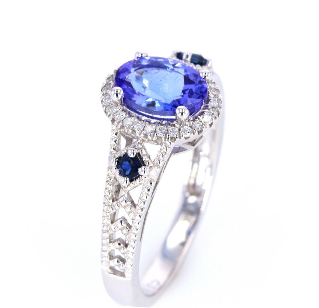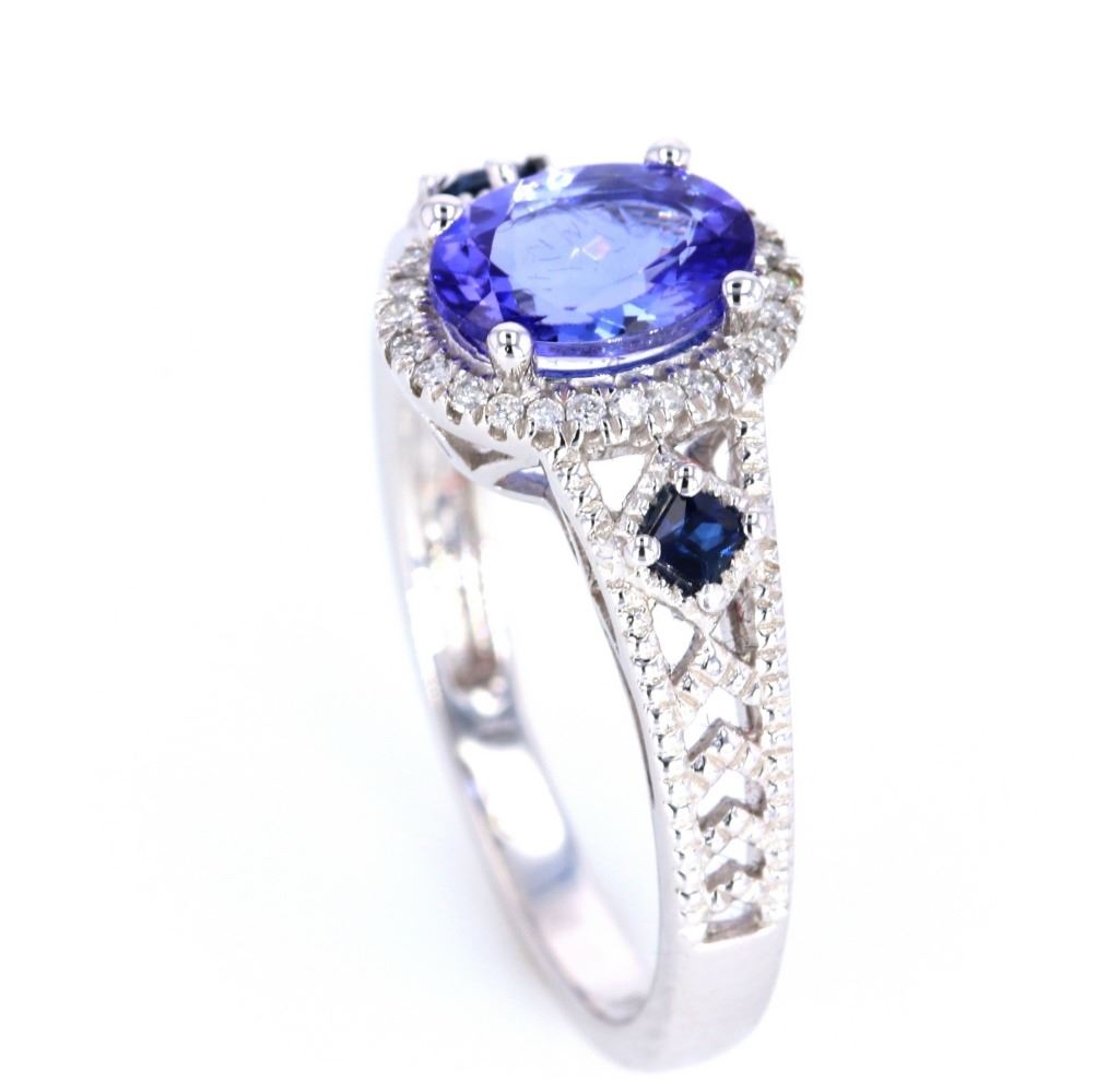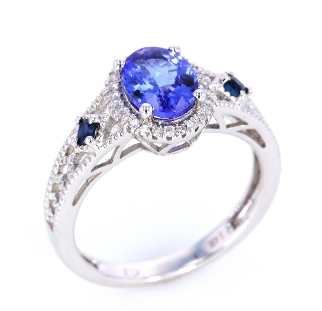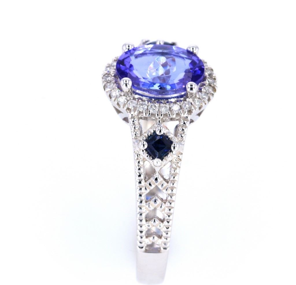 The lot features a fantastic Tanzanite and Diamond 14K white gold ring. Tanzanite Is a very rare precious gemstone that is only found in the Usumburu Mountains that border the Umba Valley of northern Tanzania. Originally discovered in 1967 by Tiffany & Company who named the stone Tanzanite. This example is unique due to its exceptional pleochroism (an optical phenomenon in which a stone has different colors when observed at different angles). This example shows an artful Art Deco styling brand new ring showing a 14K and CJ stamping. The ring holds a beautiful AAA Quality natural Tanzanite stone at the center having a nice transparent quality, oval modified brilliant cut and 1.37 carat weight. The ring is also accented by two square step cut Tanzanite stones with a weight of 0.12 carats. The center stone is prong set and shows a step halo bezel set with 26 round brilliant natural Diamonds having a weight of 0.11 carats. The ring is in brand new condition and is a fantastic custom-made piece. Size 7 US.