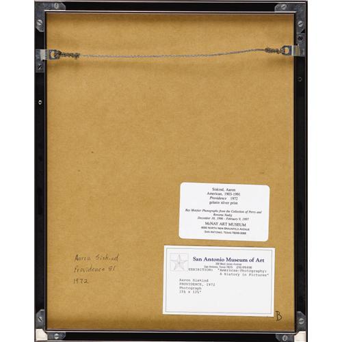 <B>AARON SISKIND</B></I><BR><I>Providence,</B></I> 1972<BR>Gelatin silver print<BR>6 x 6 inches (15.2 x 15.2 cm)<BR>Signed on matte<BR><BR>Provenance:<BR>The Collection of Mrs. Rowena Nadig (San Antonio, Texas)<BR><BR>Exhibition:<BR>McNay Art Museum, San Antonio, Texas, <I>Ray Metzker Photographs from the Collection of Perry and Rowena Nadig: December 10, 1996 - February 9, 1997</B></I>;<BR> San Antonio Museum of Art, San Antonio, Texas, <I>American Photography: A History in Pictures,</B></I> 1994 <B>Condition Report:</B> Normal signs of wear as appropriate with age, photograph is matted and framed<BR><BR><b>Shipping:</b> Requires 3rd Party Shipping (<a target="_blank" href="http://www.heritageauctions.com/common/shipping.php">view shipping information</a>) <BR><BR><B>Important notice:</