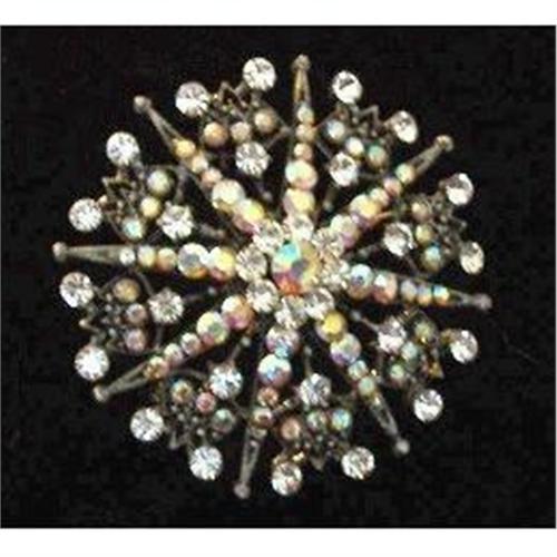 Period style Star Point and Spoke design, this large unmarked brooch and pendant combo is delicate in design yet strong on impact. Comprised of clear cut brilliants and Aurora Borealis facet cut rounds prong and paste set in a gunmetal stamped openwork filigree motif mounting.<p>Brooch, which also has a bale to wear as a pendant, measures a full two inches in diameter. Condition is rated as very good and extremely clean.<p>
