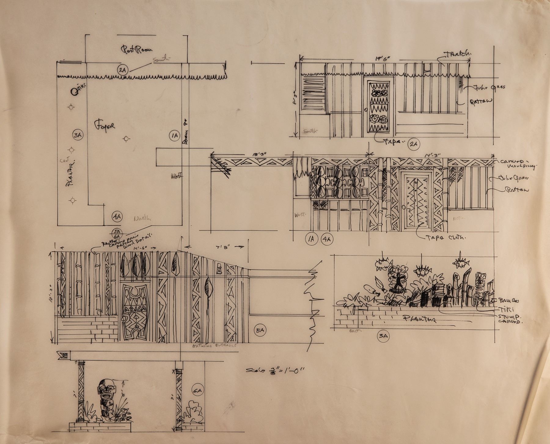 (1969) A collection of LeRoy Schmaltz original design sketches for the Abacus restaurant. Entryway and various wall treatments including tikis, wall clubs, doors, room screens, etc. 9 ink drawings on vellum and 7 stat construction reproductions. Drawings : 19"x24", Stats: 19"x24". VG+ with minor wear and creasing.