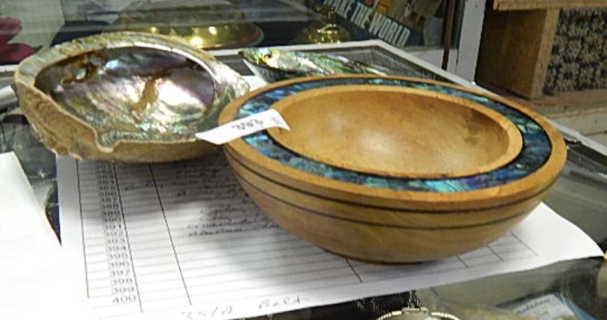 ABALONE SHELDS (2) AND HAND TURNED WOOD BOWL WITH INLAID ABALONE SHELL = 3 PC TOTAL