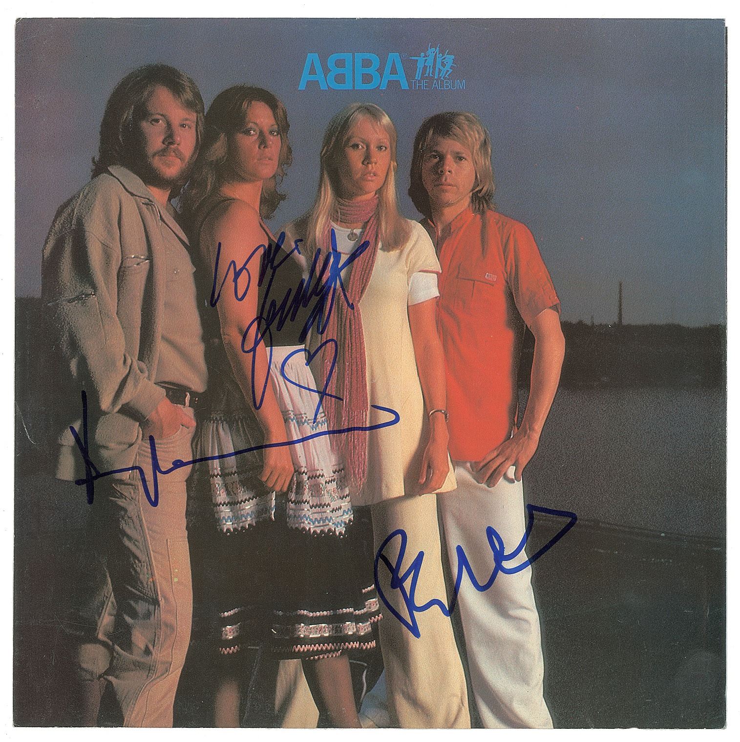 Full-color album insert from ABBA: The Album signed on the front in blue felt tip by Bjorn Ulvaeus, Benny Andersson, and Anni-Frid Lyngstad. In very good to fine condition, with some creasing. The record is not included.