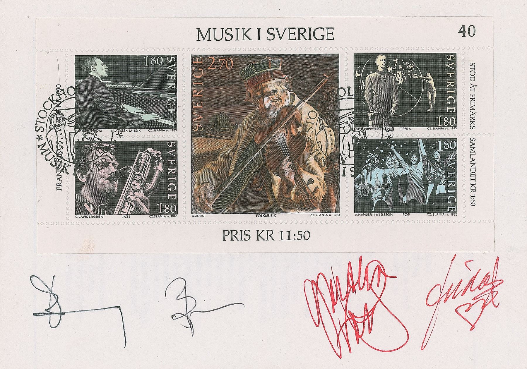 Swedish FDC with a large "Musik 1 Sverige" stamp picturing five influential Swedish musicians, postmarked in Stockholm in 1983, 6 x 4.25, signed in red and black ink by Benny Andersson, Agnetha Fältskog, Anni-Frid Lyngstad, and Björn Ulvaeus. In fine condition.