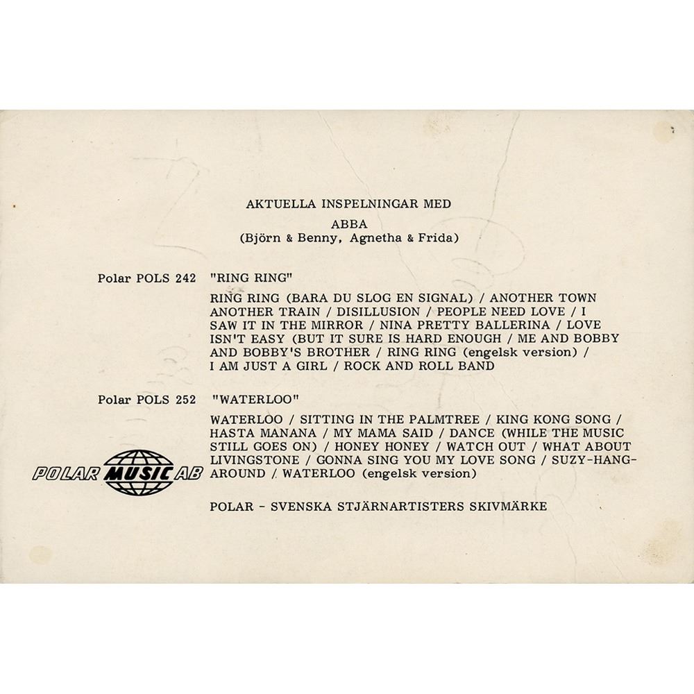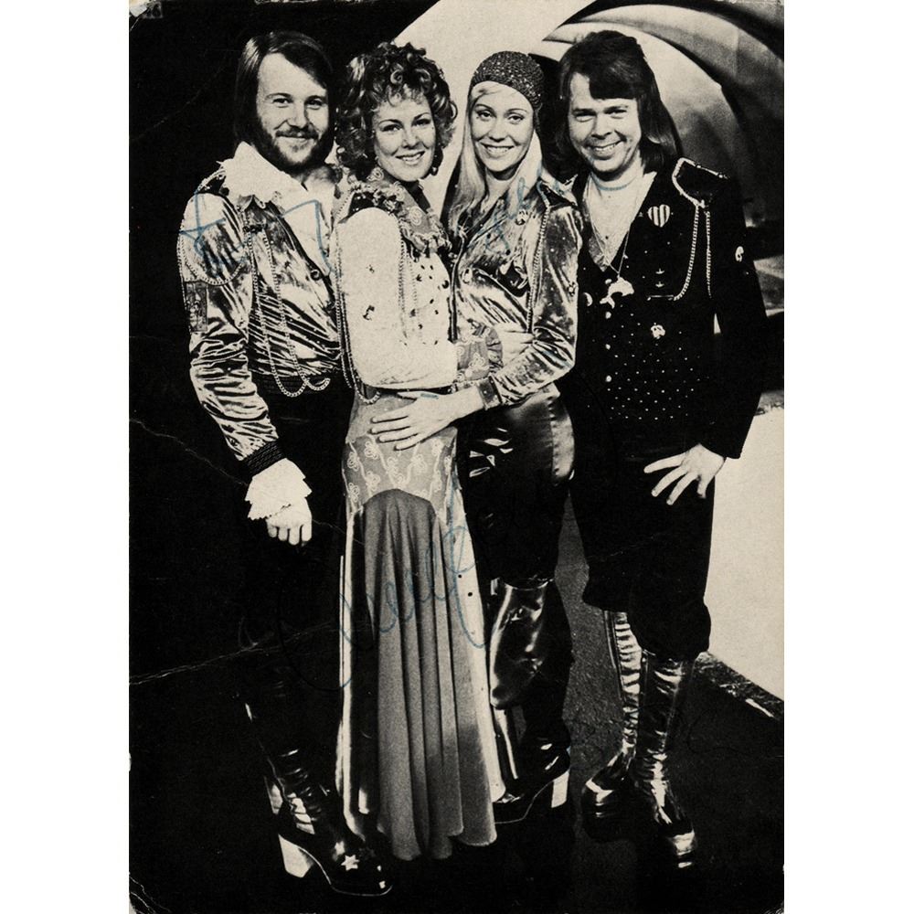 Early semi-glossy 4.25 x 5.75 Polar Music promo card of ABBA, signed in blue ballpoint by Agnetha Faltskog, Bjorn Ulvaeus, Benny Andersson, and Anni-Frid Lyngstad. Reverse features text promoting ABBA's first two albums, Ring Ring and Waterloo. In very good condition, with overall creasing and poor signature contrast. The consignor notes that the card was obtained from the 1974 Eurovision Song Contest.
