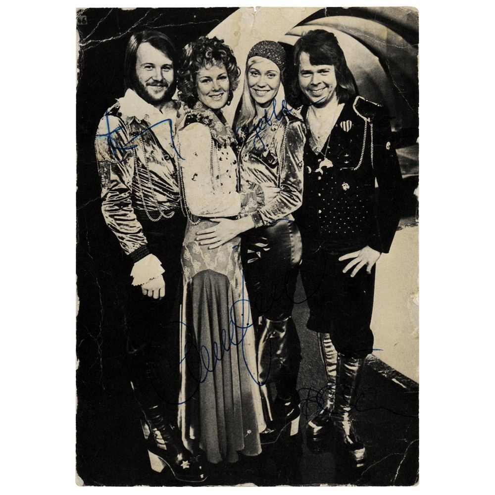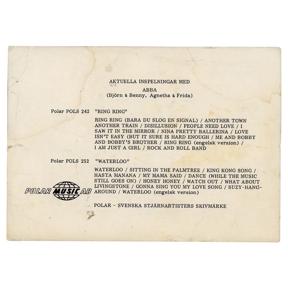 Cardstock 4 x 5.75 Polar Music promo photo of ABBA listing their 'Ring Ring' and 'Waterloo' albums on the reverse, signed in ballpoint by Agnetha Fältskog, Björn Ulvaeus, Benny Andersson, and Anni-Frid Lyngstad. In very good condition, with overall creasing, poor signature contrast, and a short tear to the top edge.