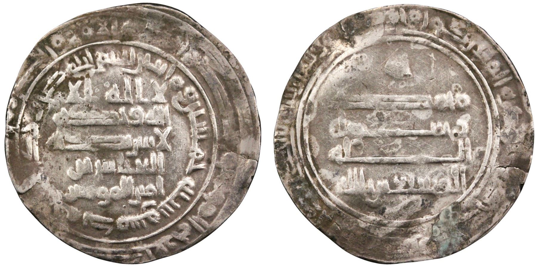 ABBASID: Abu Al-'Abbas Al-Musta'in Bi'llah (862-866), AR Dirham (2.77g), Dimashq (Damascus), AH 250. Citing heir Al-'Abbas. A-- (unrecorded). Very fine. Unpublished and unrecorded. Unique, of the highest rarity.