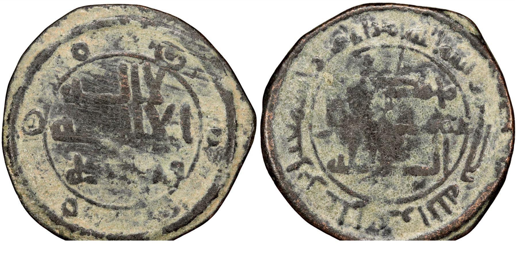 ABBASID: Abu Al-Hasan Isma'il Ibn 'Ali (750-760), AE Fals (3.02g), Al-Mawsil (also possible Fars, Al-Ahwaz, and Al-Basra), AH 133-142. Reverse margin "bism Allah amr al-amir Isma'il Ibn 'Ali a'azza Allah nasrah" (In the name of Allah, from the order of the commander Isma'il Ibn 'Ali, may Allah glorify his victory). Very fine to extremely fine. Third known specimen, of the highest rarity.