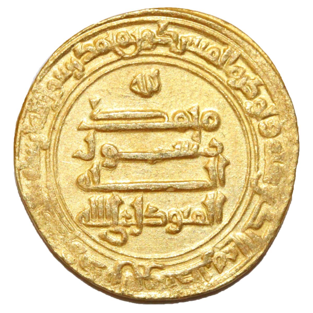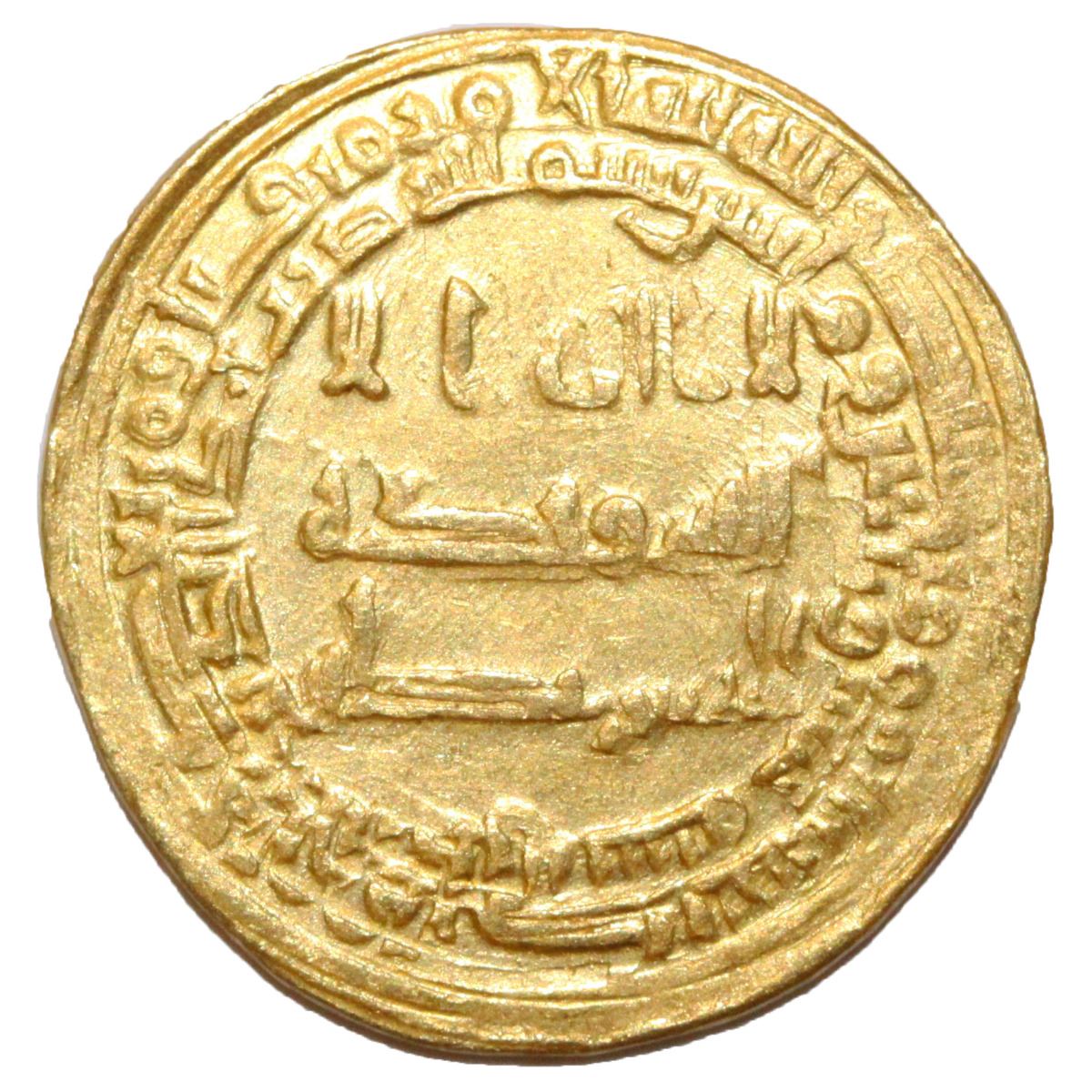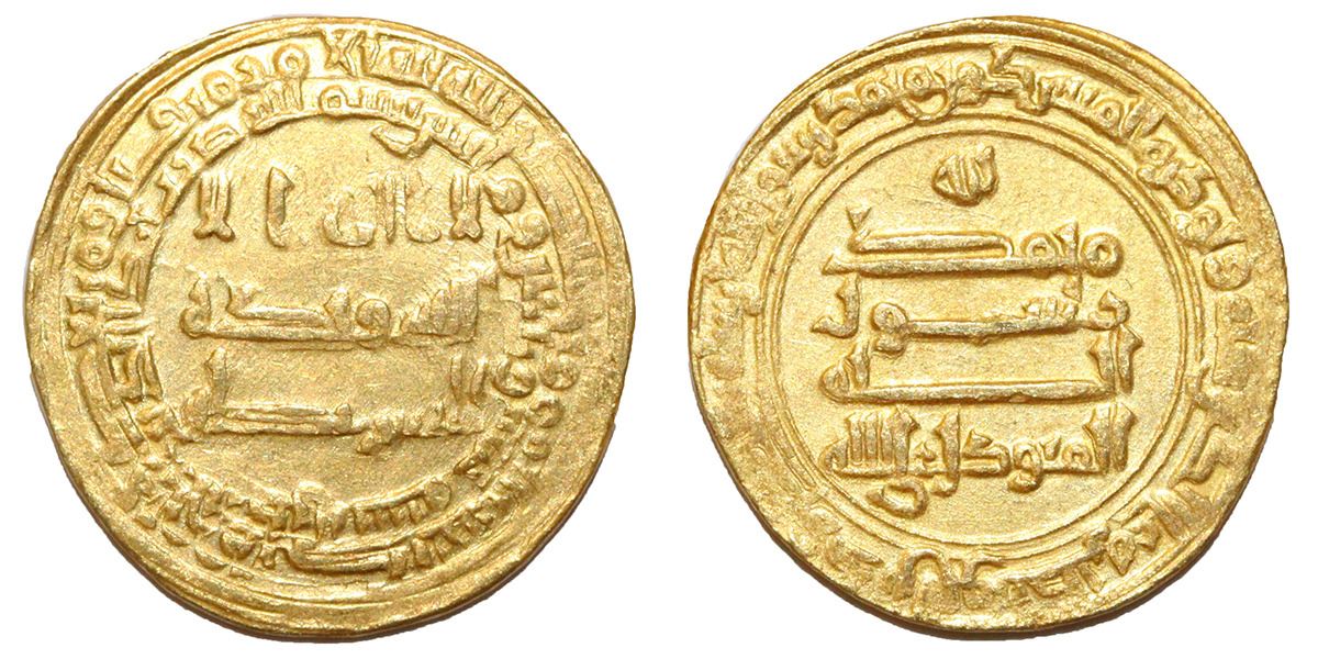 ABBASID: Al-Mutawakkil (847-861), AV Dinar (4.28g), Al-Basra, AH 235. Rare type which does not cite the heir. A-229.1. Slightly double struck, attractive bright, extremely fine. Very rare.