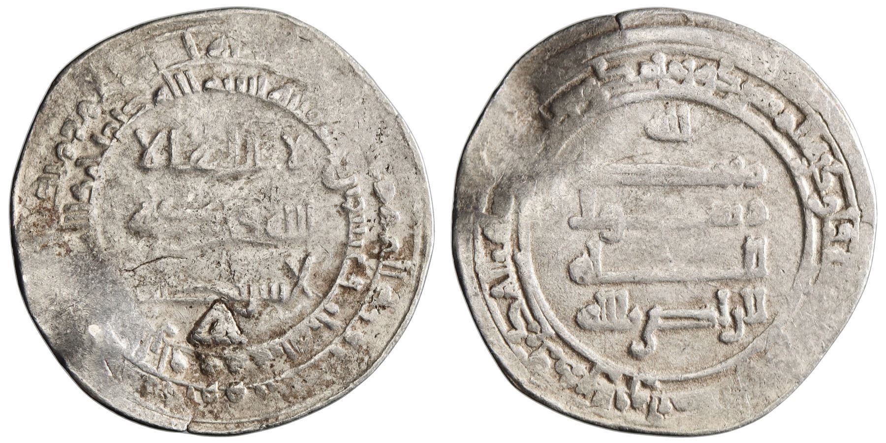 ABBASID: Al-Radi Billah (934-940), silver dirham (3.56g), Al-Rafiqa mint, AH 323. Triangle in lower obverse field. Unpublished variety, A-255.1 (for general type). Fine or better. Variety extremely rare or unique.