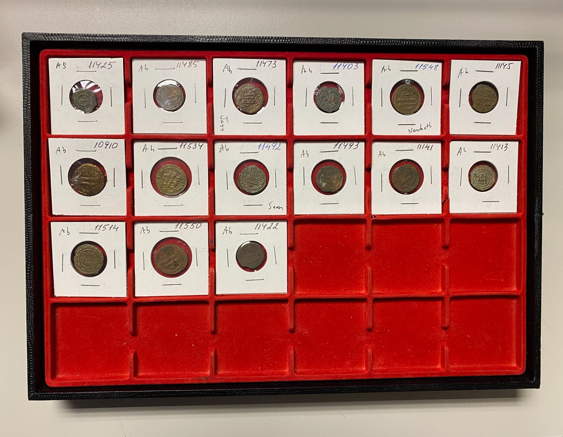 ABBASID: LOT of 15 copper fulus, various types, probably all from Central Asian mints during the period roughly AH140-200, several from Samarqand and at least one from Nawkath; average Fine to VF, a few quite attractive; unidentified, retail value about $450, lot of 15 pieces.