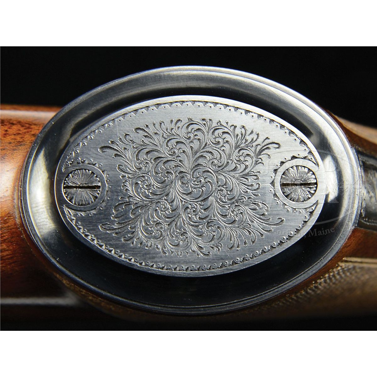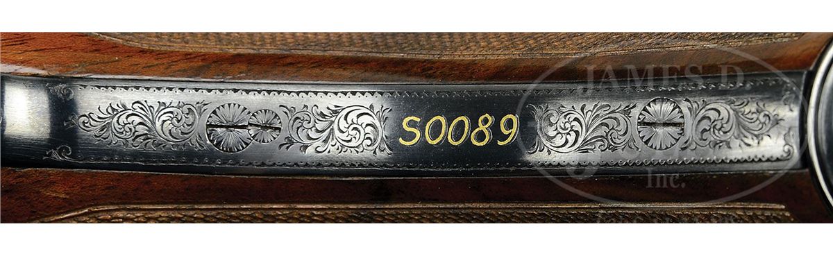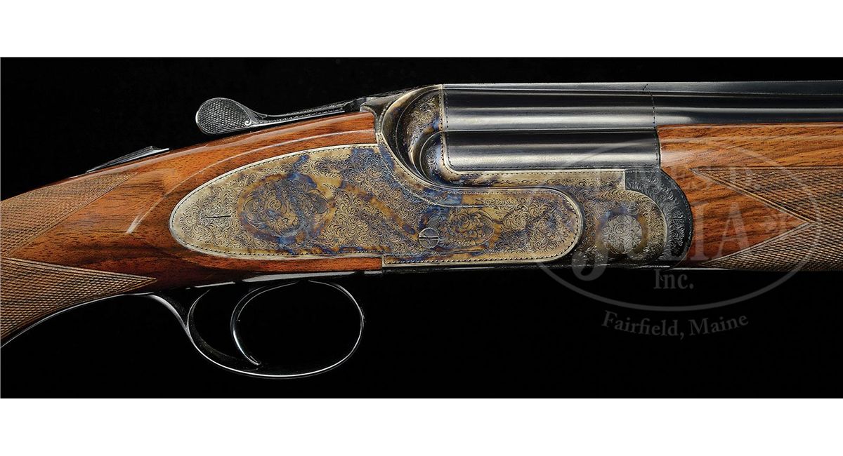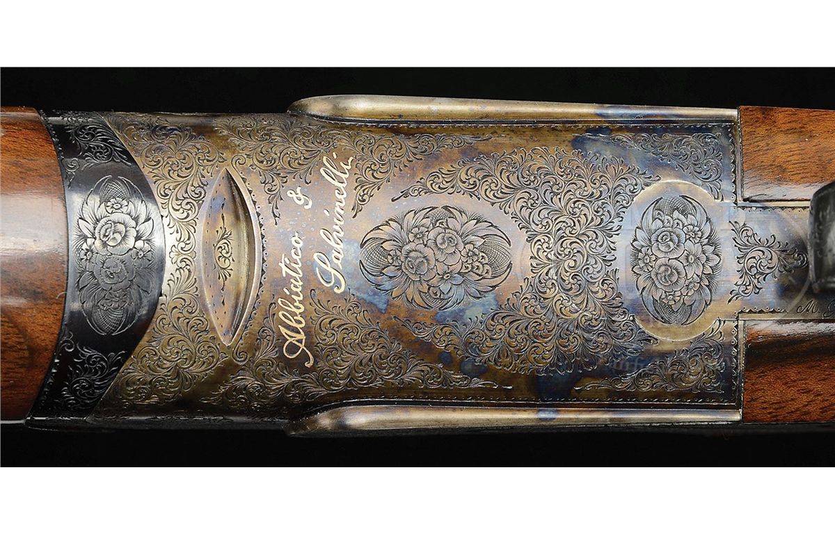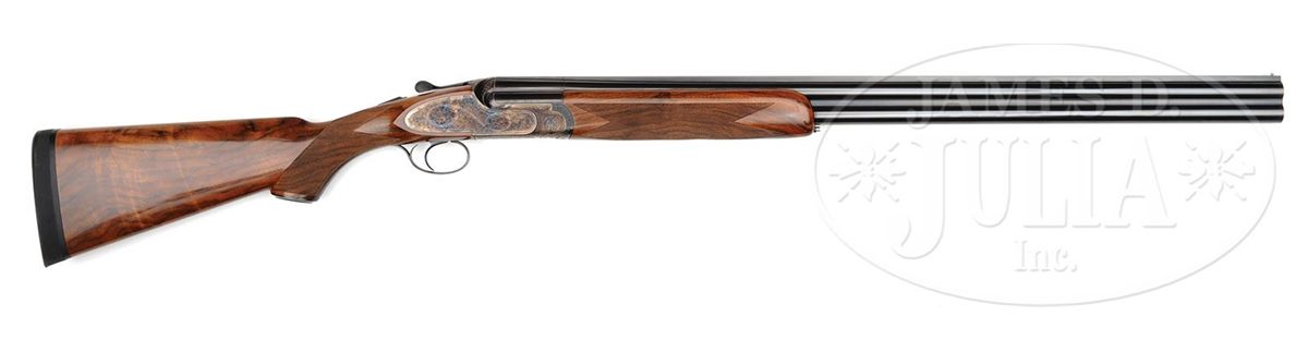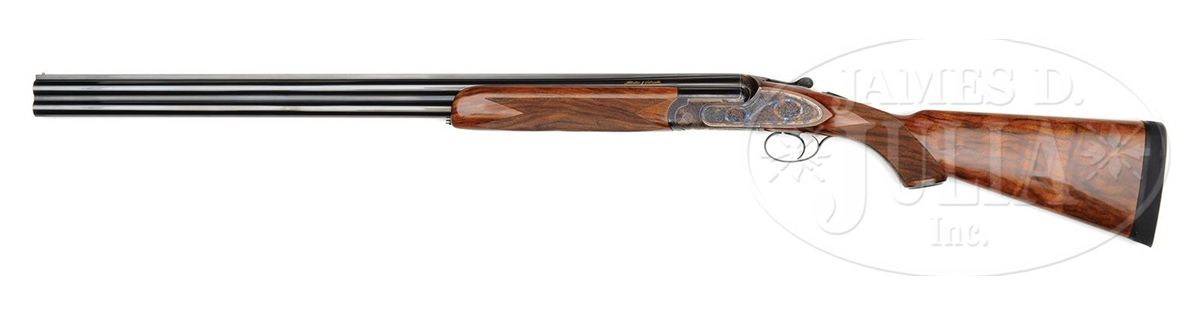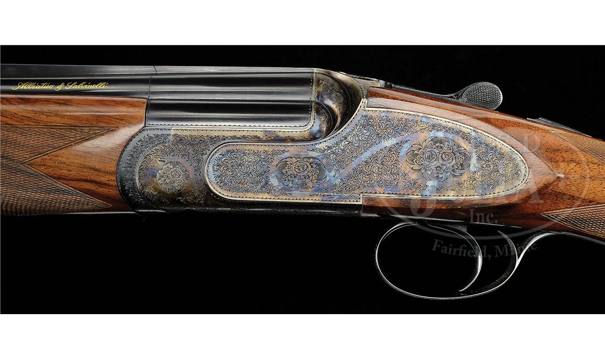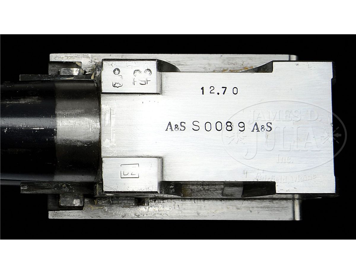 SN S0089. Cal. 12 ga. 3" Chambers. 30" Mono-bloc bbls with raised, solid, matted rib are gold inlaid "Abbiatico & Salvinelli" in script on left side of top bbl. Bottom of mono-bloc is stamped with 2005 Italian nitro proofs along with SN and "A & S". Unusual case hardened, low profile, OU sidelock action features automatic safety (SAFE inlaid in gold), single non-selective trigger, and single beaded trigger guard with tang extending to grip cap. Action and lockplates are engraved with well cut small scroll and large floral bouquets in English style. "Abbiatico & Salvinelli" is gold inlaid on right action wall, and on bottom of action. Engravers signature is on trigger plate. SN is gold inlaid on trigger guard tang. Well figured and lightly streaked, lightly marbled European walnut capped pistol grip buttstock measures 14-3/4" over solid black "Decelerator" sporting clays pad. Well cut point pattern checkering with line border is at grip, and blued steel grip cap is scroll engraved. Matching one piece ejector forend has A & S' version of an Anson release. Bore diameter: top -.727, bottom -.726. Bore restrictions: top -.013 (Lt Mod), bottom -.012 (Lt Mod). Wall thickness: top-.034, bottom -.034. Drop at heel: 2", drop at comb: 1-1/2". Weight: 7 lbs. 11 oz. LOP: 14-3/4". Famars marked blue ABS case with brown leatherite trim and three combination locks, is lined in green velvet with socks for action and bbls. CONDITION: Excellent, showing evidence of only light use. Bbls retain nearly all of their orig light blue with only a very few minor marks. Case color of action is silvering very slightly on sharpest edges. Stocks have a few very small marks in their orig finish. Checkering slightly darkened. Bores are excellent. Action is tight. Ejectors and trigger are fine. Exterior of case has some scuffs and interior has compressions from contact with gun. An unusual offering from these fine Italian gun makers. 4-47799 MGM25
