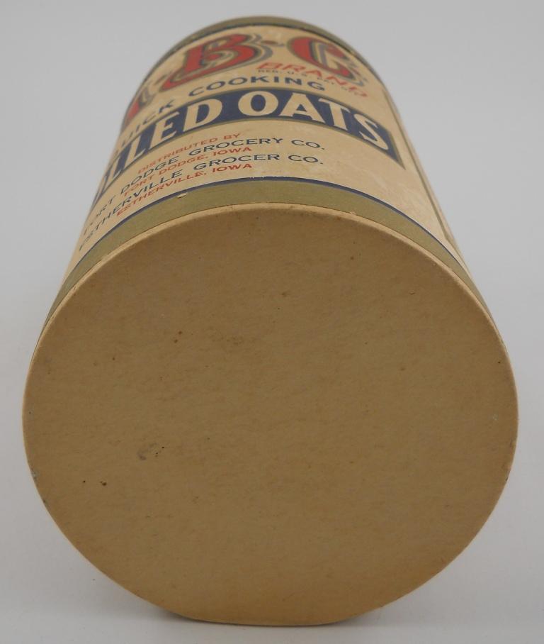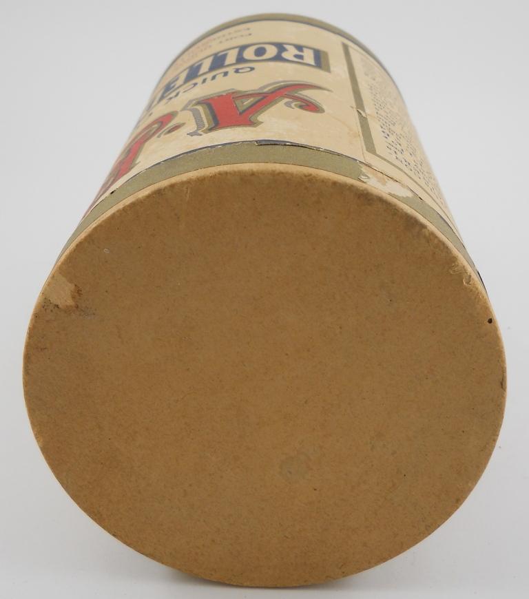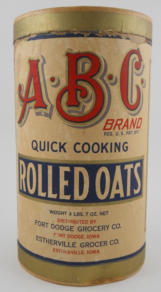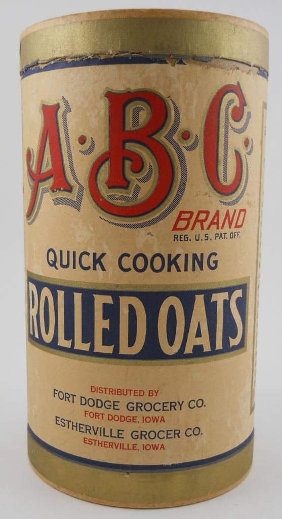The ABC Brand of quick cooking oats was distributed by Fort Dodge Grocery Co. and Estherville Grocer Co., both in Iowa. This container is made of pressed cardboard with a paper label; it has the same image on both sides. The container is 9-½ inches tall x 5-3/8 inches in diameter. It is in good condition with no dents or holes, just some paper loss around the top where the lid was opened. There is also some writing in pencil on one side near the top.