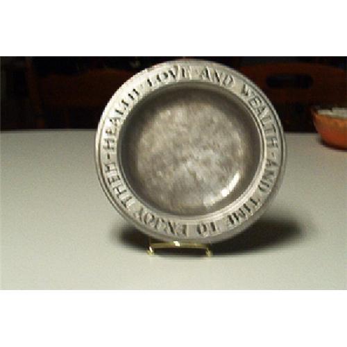 Beautiful pewter tray with the outside rim stating in large letters: HEALTH - LOVE - AND - WEALTH - AND - TIME - TO - ENJOY - THEM. Inscribed on the bottom: WILTON-COLUMBIA, PA-USA. Also there is a small circle with "RWP" along with two figuines. The measurement of this pewter tray are 9 1/2 inches in diameter; stands 1 7/8a inches tall; inside depth measures 1 inch. Excellent Conditon.