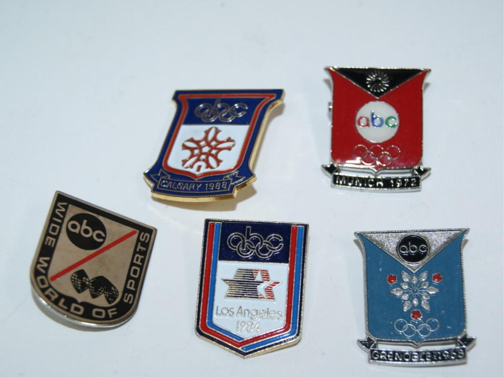 Sold Times the Money Outstanding collection of ABC Wide World of Sports Badges to Include: 1)Jacket Pin for Wide World of Sports 2)ABC pin from Grenoble Olympics, 19683)ABC Olympic pin from the ill fated Munich Olympics of 1972 4)ABC Olympic pin from the Los Angeles 1984 Olympics 5)ABC Olympic pin from Calgary Canada 1988.