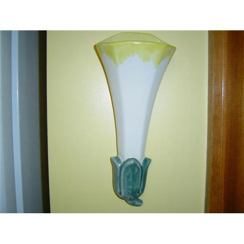 Wallpocket is made in the shape of a morning glory. It is wide at top and tapers narrow at the bottom with a molded leaf/stem. It is yellow at the edge, then white with green stem. It is manufacture numbered 586 and within a green rectangle states "ABINGDON U.S.A." It has an Art Deco look. No cracks, nics or crazing, although the inside has been lovingly used.