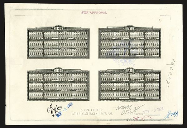 United States. 4-up ABNC calendar for 1930. Approval signers and stamps all over. VF+.
