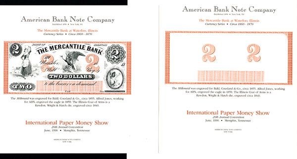 Lot of 2 cards, Both are IPMS, 1996, Memphis, TN, $2 Mercantile Bank cards, one an uncut progress proof with only red border, missing black intaglio portion and the second complete, Waterloo, IL,Barr- SO/156 Unlisted. Mint, ABNC.