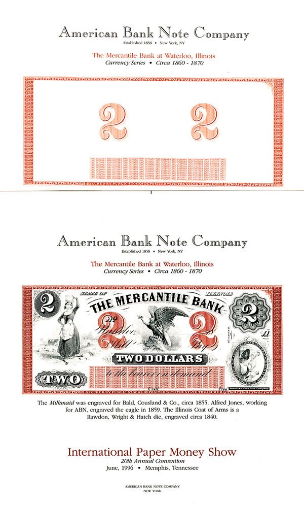 Lot of 2 cards, Both are International Paper Money Show, 20th Convention, June 1996, Memphis, TN, $2 Mercantile Bank, Waterloo, IL,Barr- SO/156 Unlisted. One has complete note and the second frame only. Mint, ABNC.