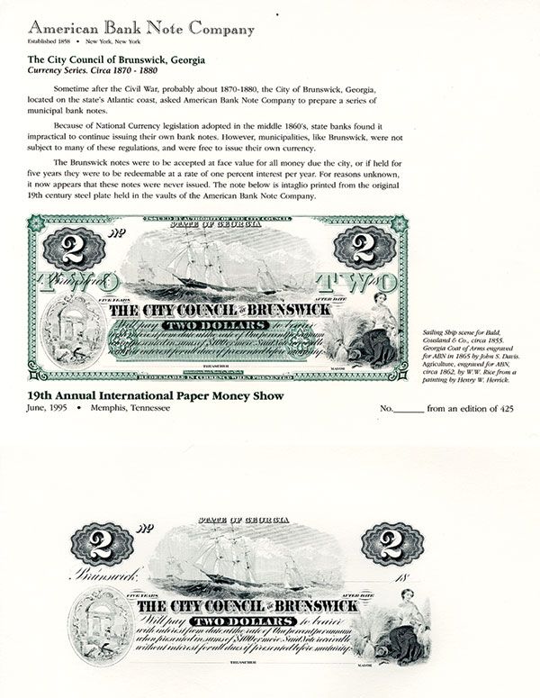 Lot of 2 cards, Both International Paper Money Show, 19th Convention, June 1995, Memphis, TN, $2 City Council of Brunswick, GA, one complete but not signed or numbered and a proof of the vignette, title and text on large card with no other printing. Mint, ABNC.