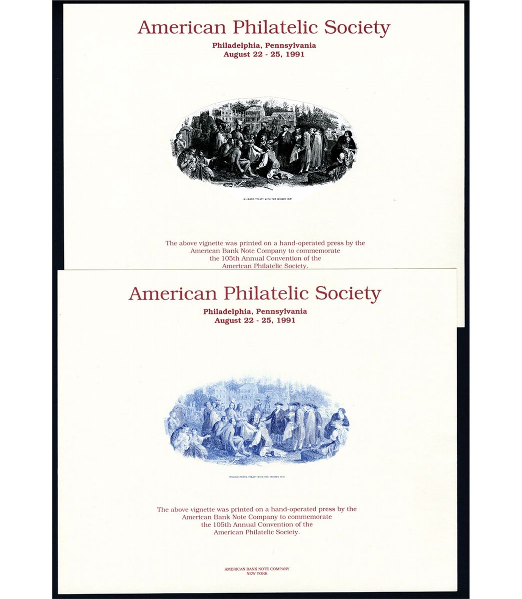 American Philatelic Society 1991ÊMock up of Final design William Penn's Treaty with Indians, also includes one in Blue they may be a trial color, BarrÊSO/79, Notes on Verso Rare.