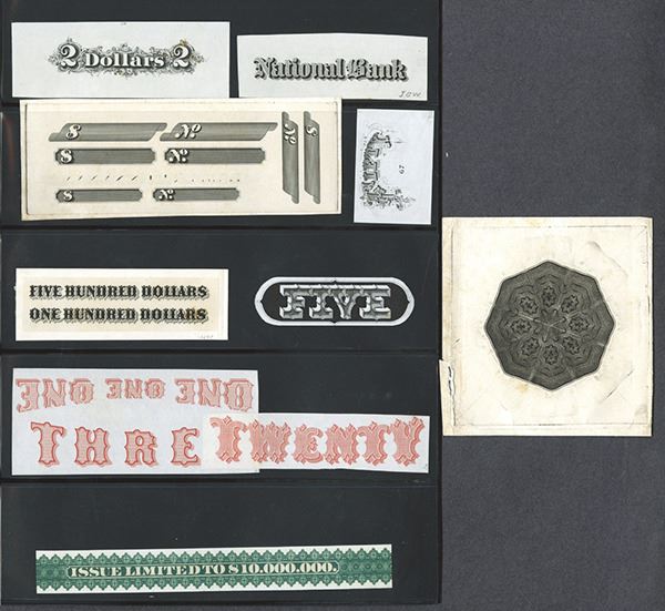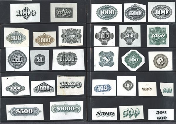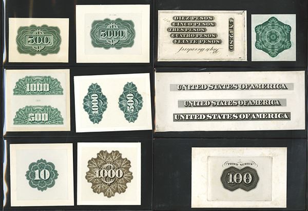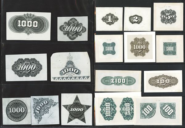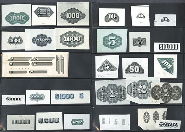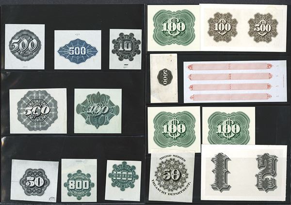 Selection of india paper proofs, some mounted on card stock. Some used for Federal Bonds, others for a variety of items. A wide selection. 110 paper fragments, some with multiple images. As made.