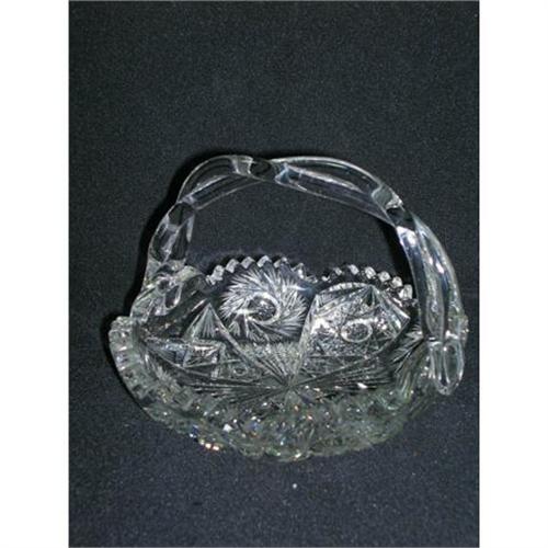 </font></strong>This is a very beautiful little basket made from a nappy or ice cream bowl form.  The handle is two pieces of glass twisted and attached at two plane scallops.  Between these scallops are saw toothed points and all are in perfect condition.  The pattern is of two Hobstars with four Pinwheels around the edge of the bowl.  The bottom is divided into four portions with Notched Prisms and Fans.  All of the fans on this little basket are frosted but all else is polished.  There are no chips, flakes or cracks on this beautiful little piece of American Brilliant Cut Glass.</font>
