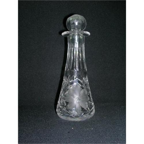 This is a beautiful American Brilliant Period cut glass perfume or cologne bottle. It is cut in a floral design with leaves, flowers, stems, and a blazing star. The flowers and the fains of the blazing star are all unpolished. The hollow stopper is cut in a matching pattern of the flower. The bottom is cut in a 16 point ray. The neck is cut in flat notched panels. This bottle is 8-1/2" tall to the top of the stopper and 6-3/4 to the rim. The rim is 2-1/4" in diameter and the bottom is 3" in diameter. The bottle is fairly heavy for its size. This style was more prevalent later in the Brilliant Period from the 1890's to the 1920's but I would put this earlier around 1900-1910 era. This bottle is in excellent condition with no chips, flakes or cracks.