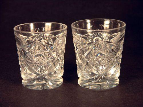 ABP Cut Glass Juice Glasses, matching pair. No chips or cracks, normal wear to bottom otherwise excellent condition. 2 1/2 inches tall.