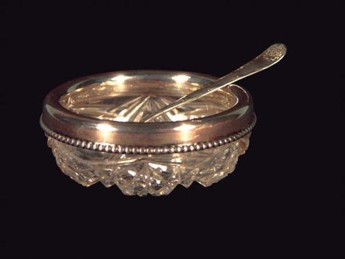 ABP Cut Glass Salt Dip with sterling silver rim and spoon. No chips or cracks. 3 inch dia.