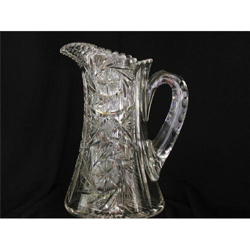 A heavyweight American Brilliant Period 10.5" tall pitcher (or jug) in pinwheel, hobstar, and fan motif with 24-point flashed star center. Excellent!</em></td>