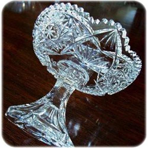 With unlocated signature, this American Brilliant Period cut glass jelly compote is strongly similar to Dorflinger's Colonial pattern. Vesica and cross hatch miter, 18 point double cut hobstar with prism star button, fan, reverse diamond fan and a clear center framed with a cross cut, 6 point mitered star. Zipper cut flat panel stem and open petal foot. Scallop and crown u-notched rim.<p>Compote measures 4.5 inches high with a 5.5 inch diameter bowl. Blank is white, clear and in very good condition with no chips, flakes or residue. Cutting is superb.<p>