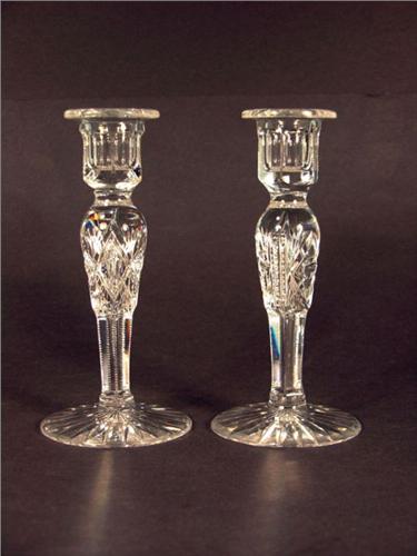 ABP Pair of Cut Glass Candle Sticks. No chips or cracks, shows normal wear on bottom otherwise excellent condition. 7 1/2 inches tall.
