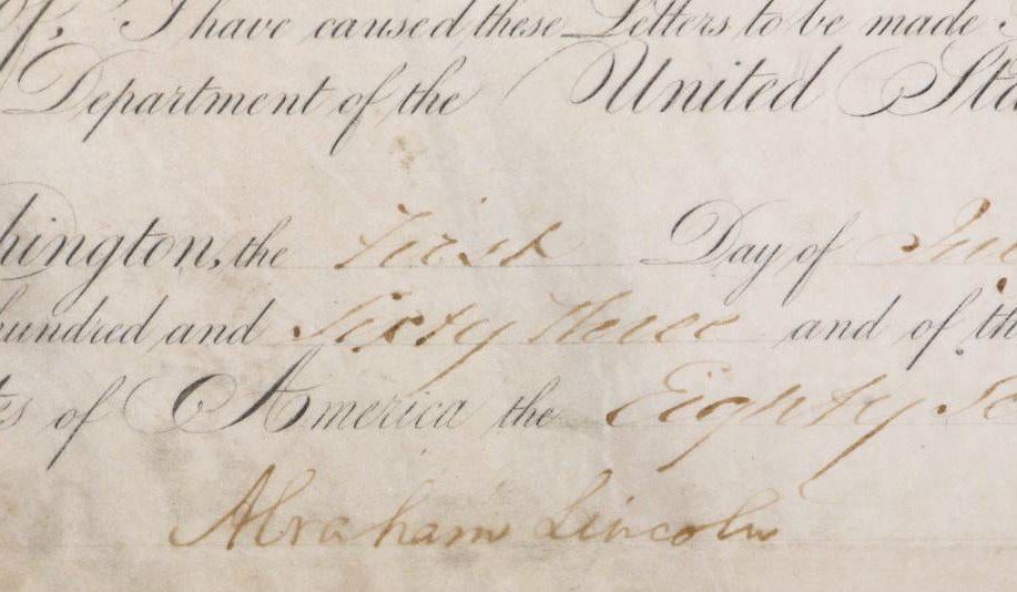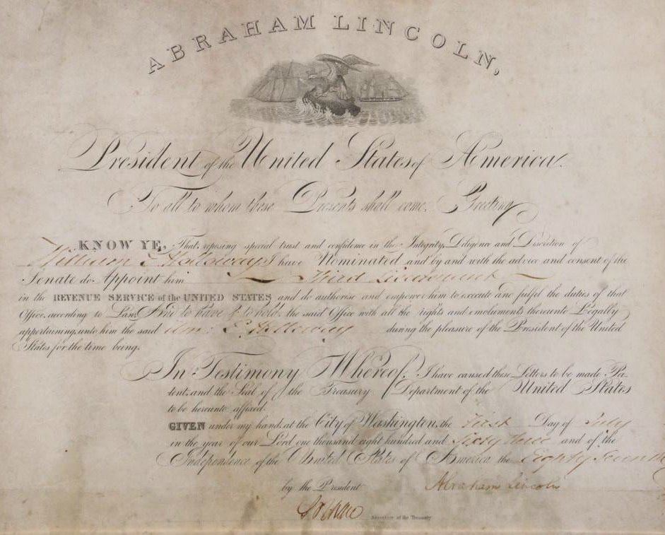 Abraham Lincoln Document Signed Nominating William E,. Holloway as Third Lieutenant, dated July 1st, 1863, countersigned by Salmon P. Chase as Secretary of the Treasury.