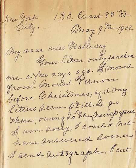 A.L.S. of Mrs. Charles Sabin Taft, wife of the physician who jumped into service at Ford's Theatre during Lincoln's assassination, 4pp. 8vo., New York, May 9, 1902, to Miss Halliday, in part: "...Your letter only reached me a few days ago...private secretary...John Hay, who is now Sec. of State, I don't remember who was Andrew Johnson's, but can find out for you. If you would like to have a Mount Vernon paper with the story of the last house of Lincoln, written by Dr. Taft, let me know...I have quite a relic the cuff button that Lincoln had on the night of the assassination. Dr. [Taft] was present at the autopsy next day at the White House, and brought home a lock of Mr. Lincoln's hair...I was in the theatre, with my husband, on that fatal night...". Torn at top with a bit of loss of text, otherwise very good.