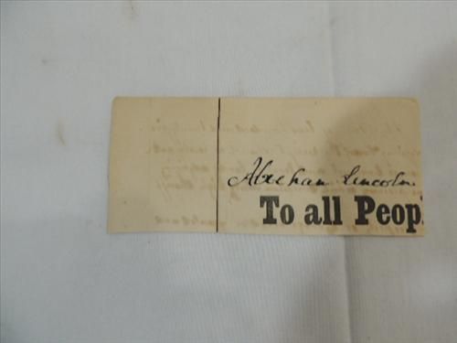 ABRAHAM LINCOLN CUT SIGNATURE AUOTGRAPH NO COA. AS SHOWN. VIEW PICTURE FOR DETAIL. PLEASE BE ADVISED, AND INFORMED REGARDING SIGNATURES OR AUTOGRAPHS THAT WE SELL AT AUCTION: WE ARE NOT AUTHENTICATORS, AND WE DO NOT AUTHENTICATE, OR VALIDATE ANY AUTOGRAPHS OR SIGNATURES THAT WE OFFER AT AUCTION. SOME AUTOGRAPHS OR SIGNATURES MAY COME WITH AN AUTHENTICATION FROM ANY ONE OF LITERALLY HUNDREDS OF AUTHENTICATORS ACROSS THE COUNTRY, AND AROUND THE WORLD. WE DO NOT ENDORSE ANY AUTHENTICATOR, NOR DO WE GUARANTEE THAT ANY AUTOGRAPH OR SIGNATURE IS AUTHENTIC, OR THAT IT WILL PASS AUTHENTICATION BY ANY AUTHENTICATOR. ALL AUTOGRAPHS OR SIGNATURES ARE SOLD