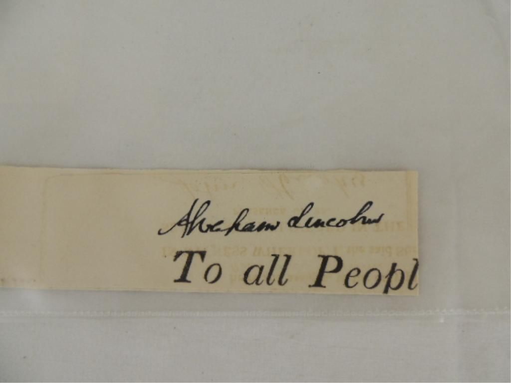 ABRAHAM LINCOLN CUT SIGNATURE AUTOGRAPH. NO COA AS SHOWN. VIEW PICTURE FOR DETAIL. PLEASE BE ADVISED, AND INFORMED REGARDING SIGNATURES OR AUTOGRAPHS THAT WE SELL AT AUCTION: WE ARE NOT AUTHENTICATORS, AND WE DO NOT AUTHENTICATE, OR VALIDATE ANY AUTOGRAPHS OR SIGNATURES THAT WE OFFER AT AUCTION. SOME AUTOGRAPHS OR SIGNATURES MAY COME WITH AN AUTHENTICATION FROM ANY ONE OF LITERALLY HUNDREDS OF AUTHENTICATORS ACROSS THE COUNTRY, AND AROUND THE WORLD. WE DO NOT ENDORSE ANY AUTHENTICATOR, NOR DO WE GUARANTEE THAT ANY AUTOGRAPH OR SIGNATURE IS AUTHENTIC, OR THAT IT WILL PASS AUTHENTICATION BY ANY AUTHENTICATOR. ALL AUTOGRAPHS OR SIGNATURES ARE SOLD