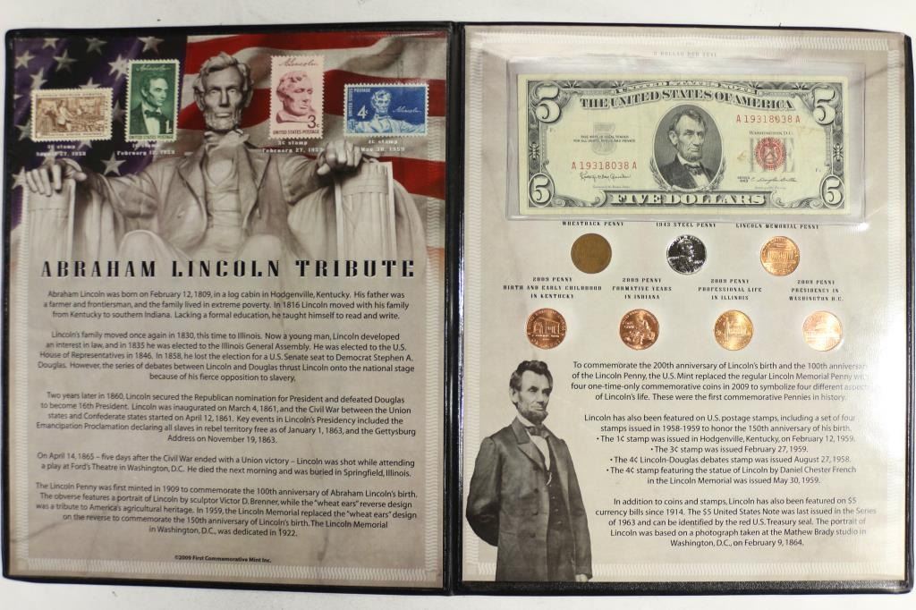 RED SEAL NOTE, WHEAT BACK CENT, STEEL PENNY, MEMORIAL PENNY, ALL 4-PRESIDENTIAL CENTS AND 4 MINT UNUSED STAMPS ALL IN FOLIO