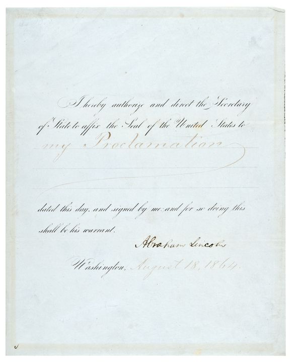 “I hereby authorize and direct the Secretary of State to affix the Seal of the United States to my Proclamation, dated this day, and signed by me and for so doing this shall be his warrant. -- (Signed) “Abraham Lincoln” --- Washington, August 18,1864.”